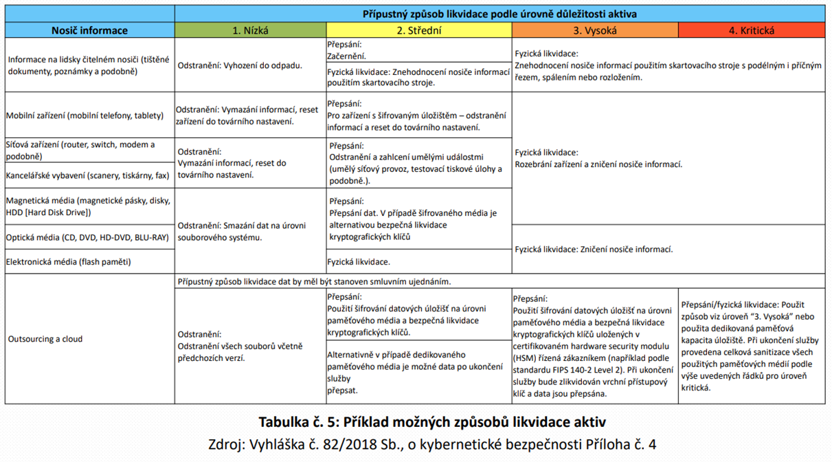 - použitelné způsoby likvidace dat vzhledem ke stavu nosiče informace.