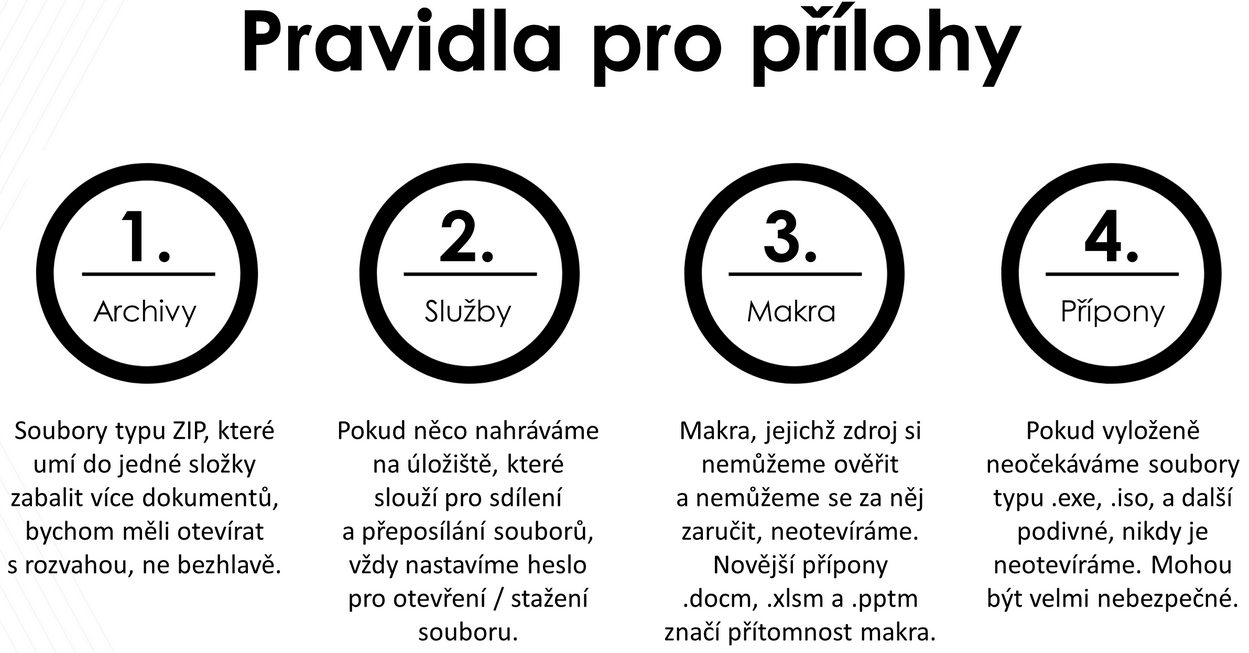 Nejnebezpečnějším typem příloh v rámci útoků, jsou spustitelné soubory s přílohou exe. (např. faktura.exe), popř. staré verze MS Office (např. doc. xls). Zároveň pokud v rámci těchto souborů vyskočí hláška, jestli chceme spustit makra, tak rozhodně nedávejte ano.