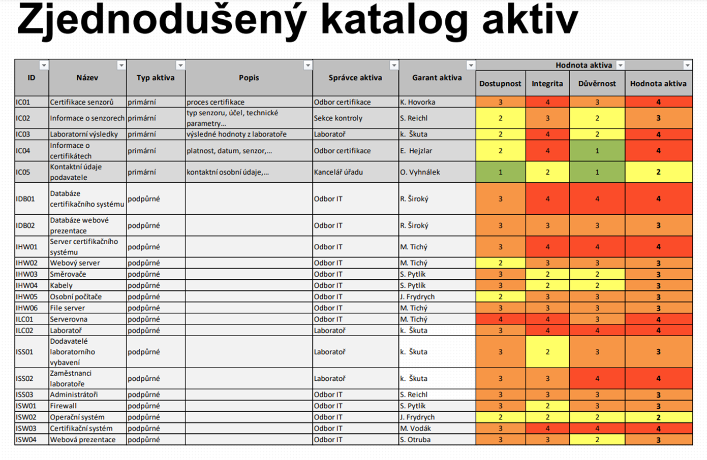 Hodnocení aktiv provádějí garanti aktiva ve spolupráci s manažerem kybernetické bezpečnosti. Výsledkem je katalog aktiv s přiřazeným hodnocením: